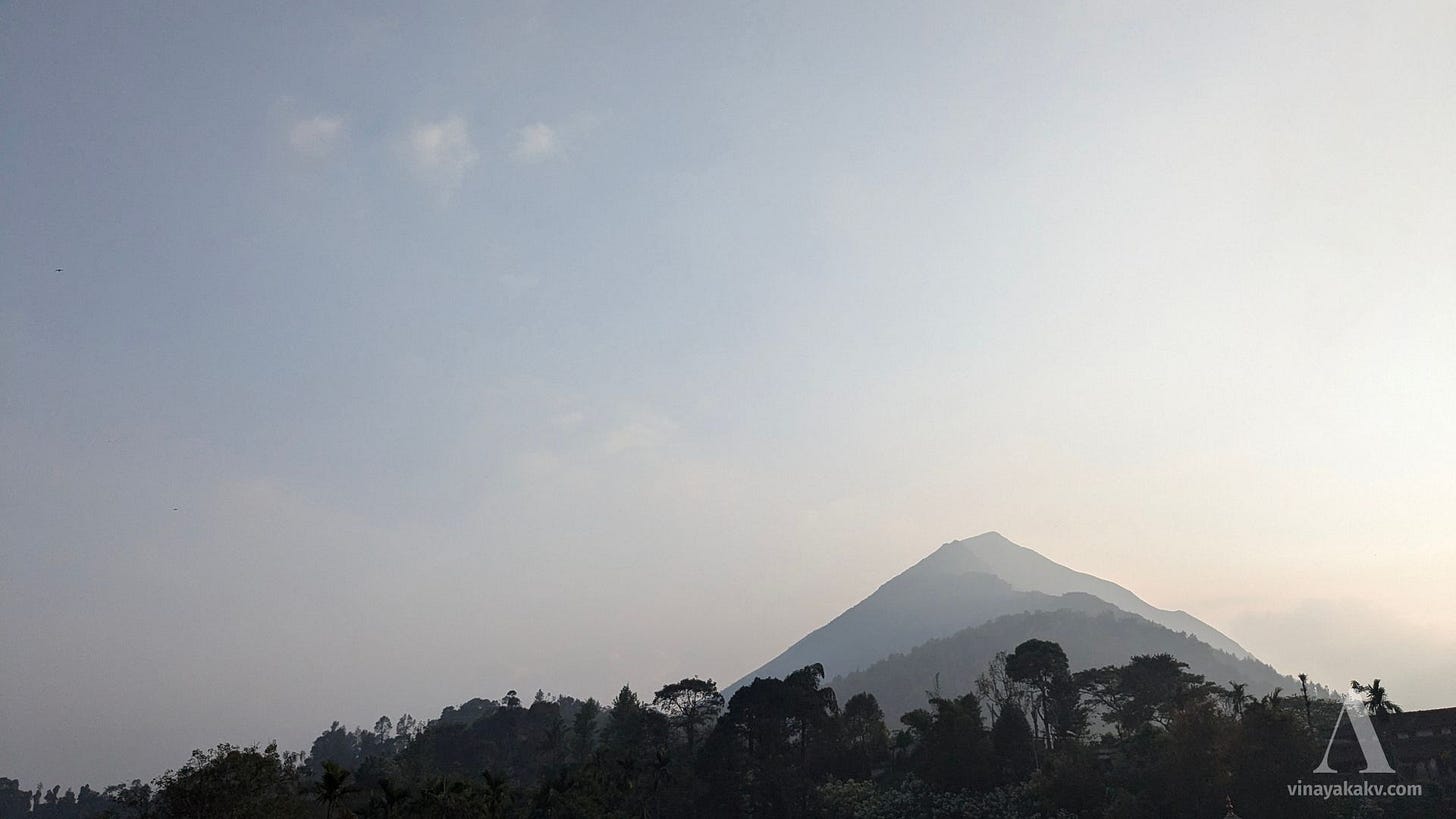 Several prominent mountains rose above the inversion line, with the pyramid-shaped Mertiparvata (~1610m) standing out as a remarkable sight.