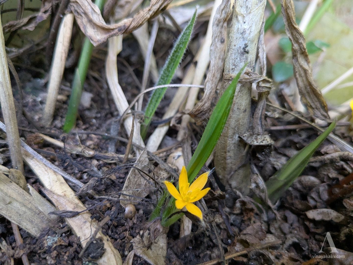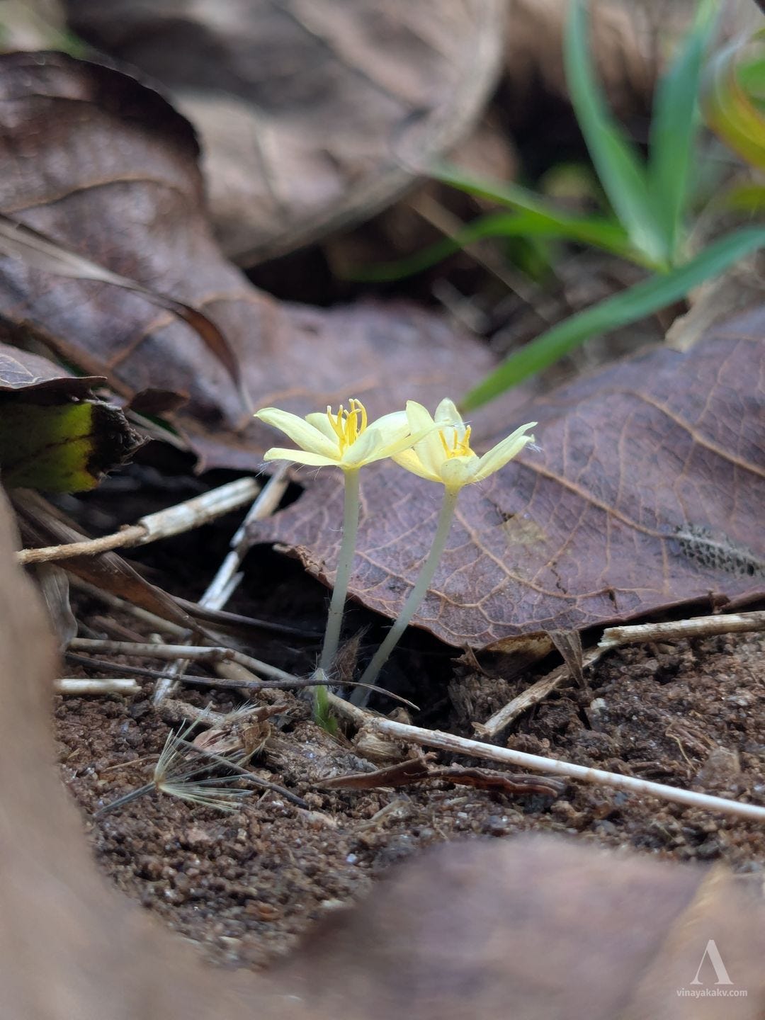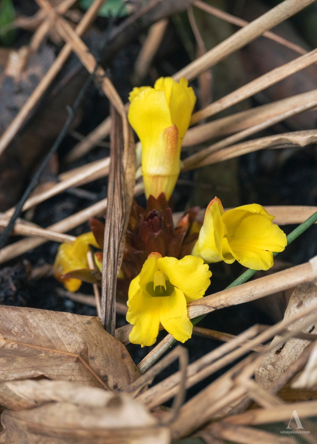 The yellow dots amongst the dried grass mentioned earlier are also contributed by the starry flowers of Curculigo orchioides. They follow a similar flowering cycle as Curcuma — flowers, leaves, and flowers again before wilting. Their leaves superficially resemble those of the coconut — hence the name “Ground coconut”.