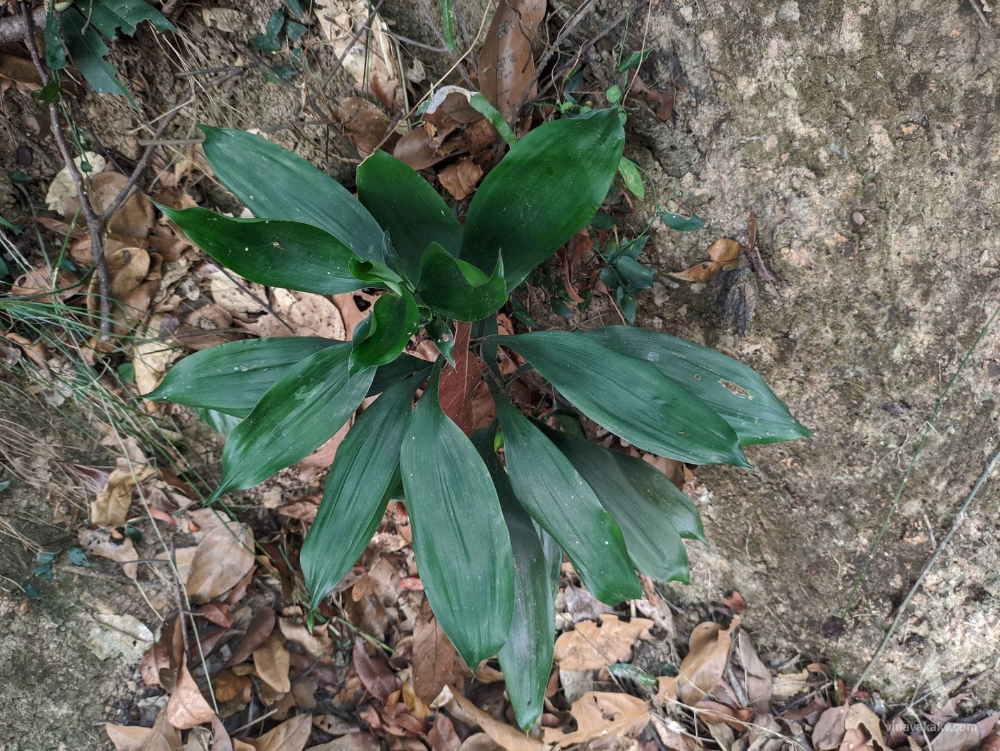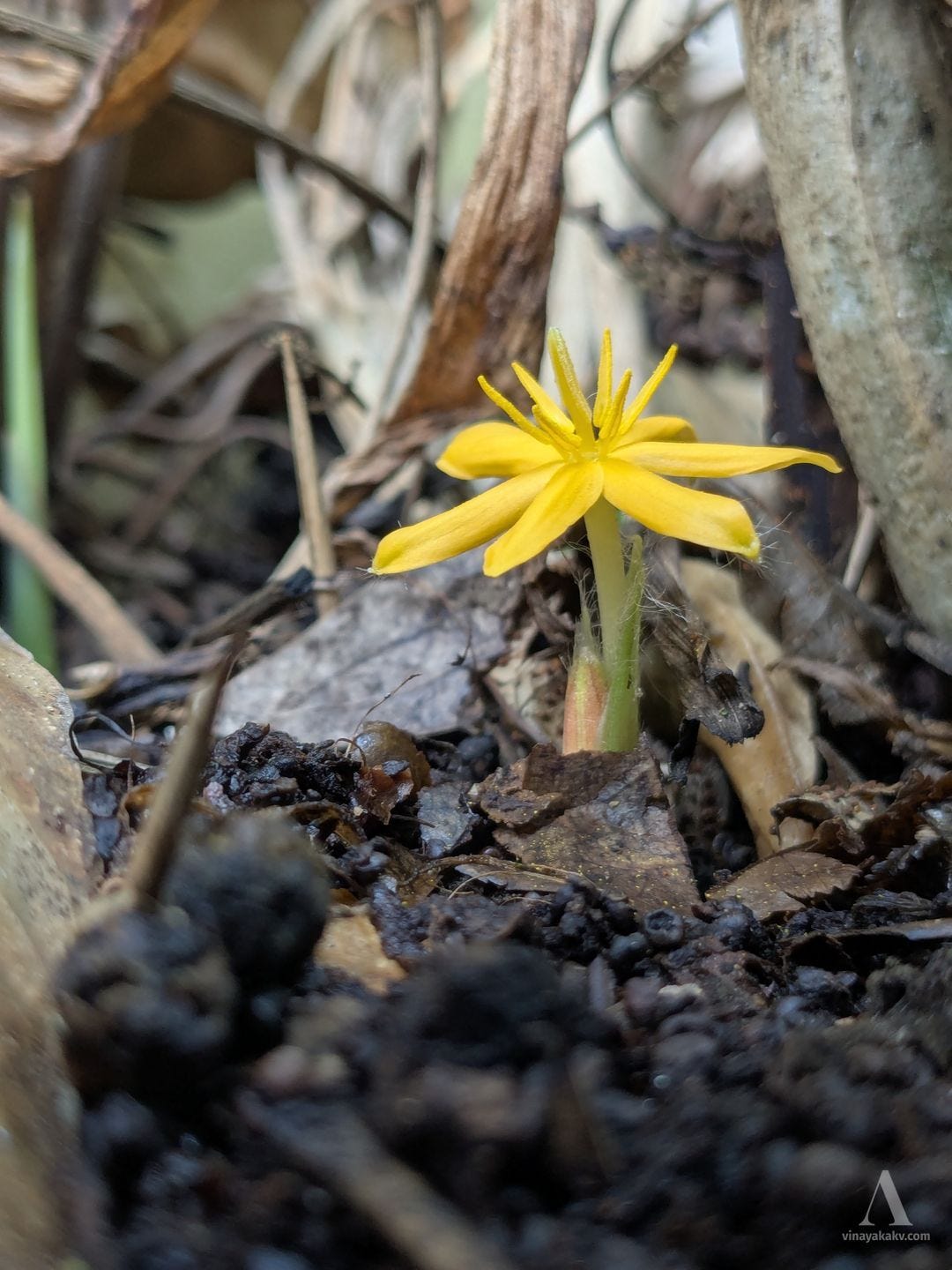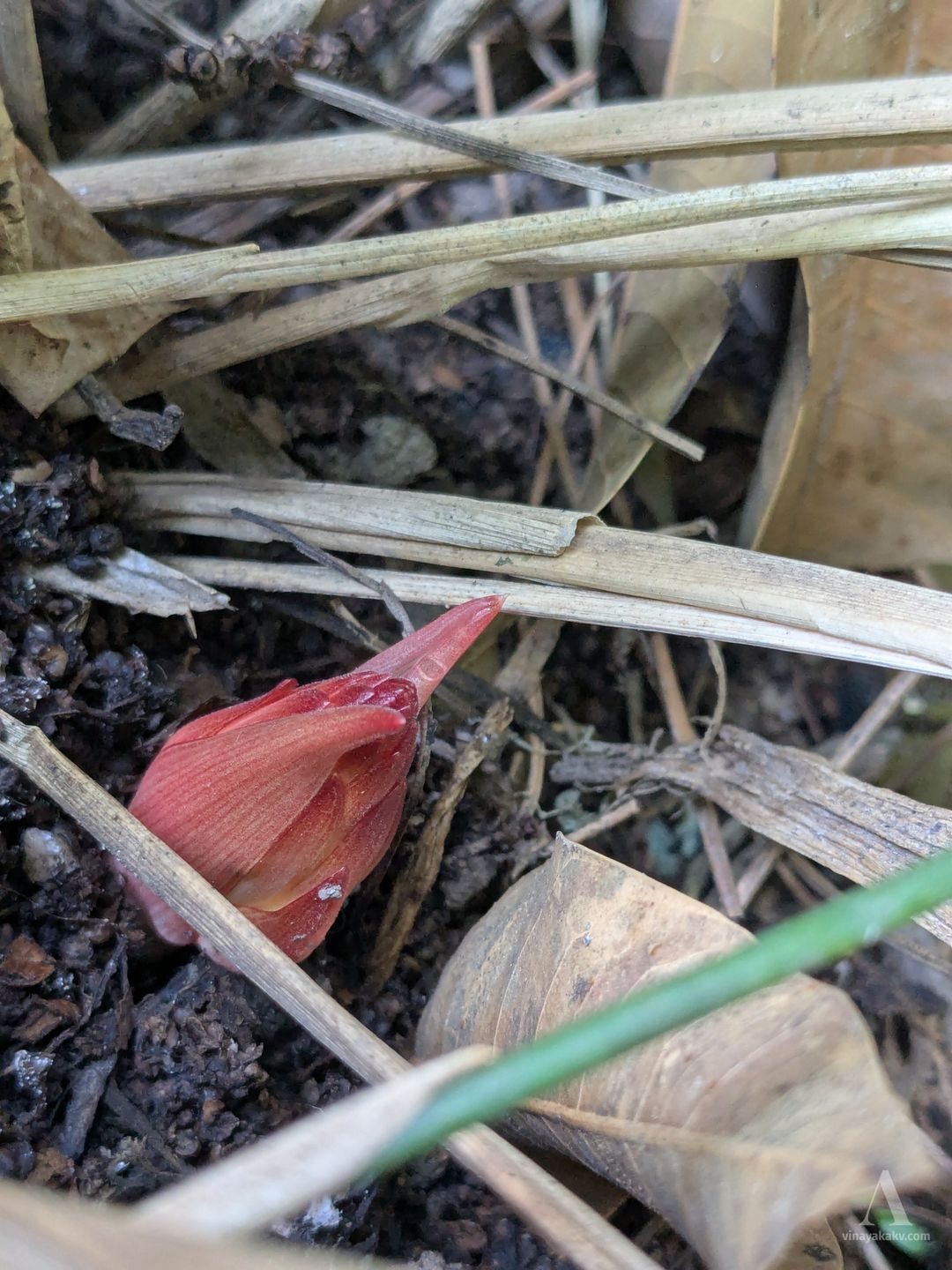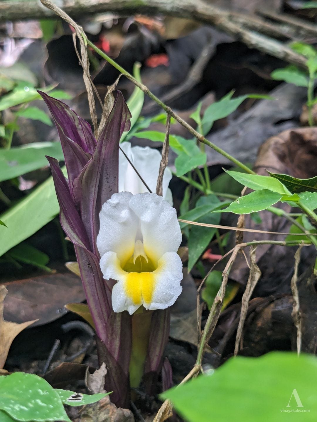 The yellow dots amongst the dried grass mentioned earlier are also contributed by the starry flowers of Curculigo orchioides. They follow a similar flowering cycle as Curcuma — flowers, leaves, and flowers again before wilting. Their leaves superficially resemble those of the coconut — hence the name “Ground coconut”.