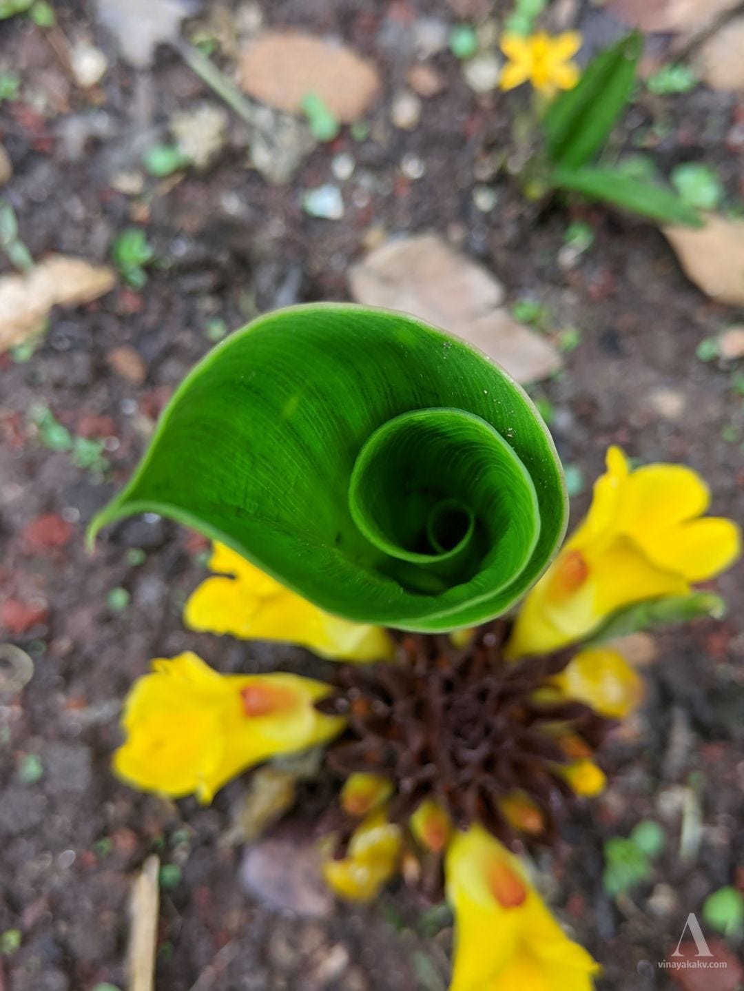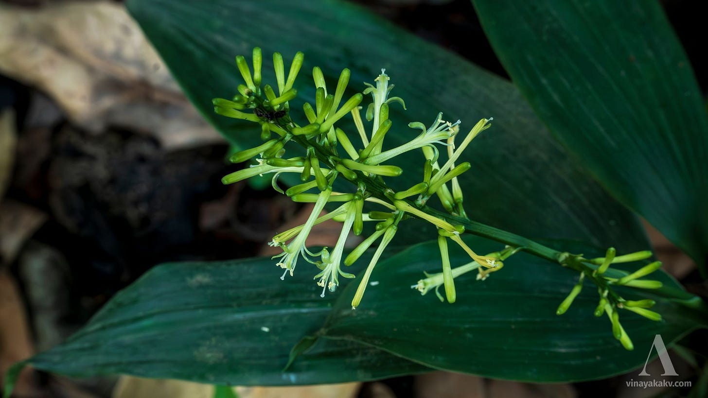 Once they flower, the leaves of the plant start to appear, in the usual style of the coiled leaves unfolding in a beautiful spiral. Due to the spiral leaves, the plant is also called “Suruli Gida” locally, meaning the coil plant.