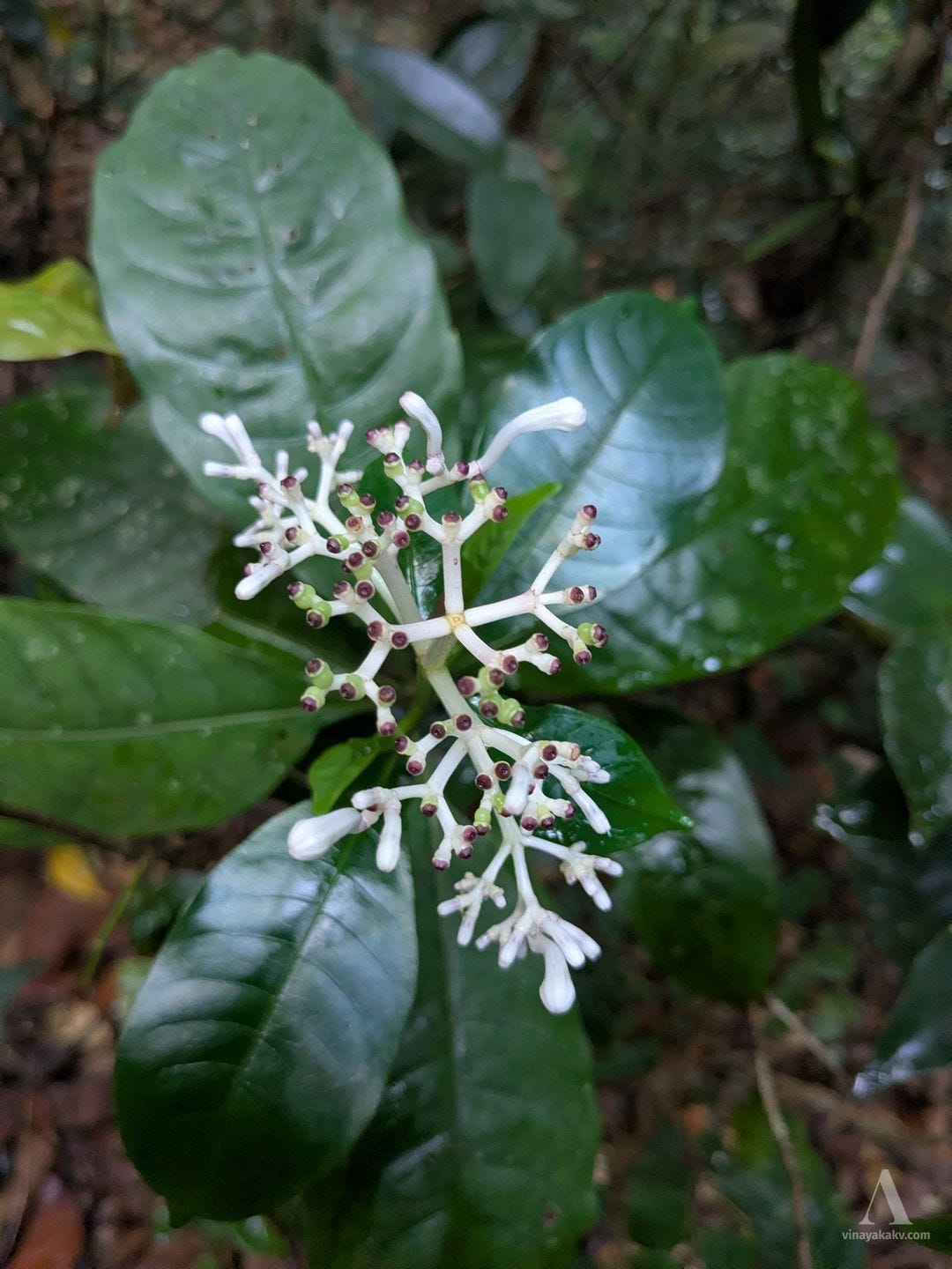 There are many plants that belong to the Coffee family that are native to India. Many of them flower at the same time as Coffee plants, but their fruiting schedules are different. One such plant, Chassalia curviflora, is attractive with its white flowers and their arrangement on the flower stalk.