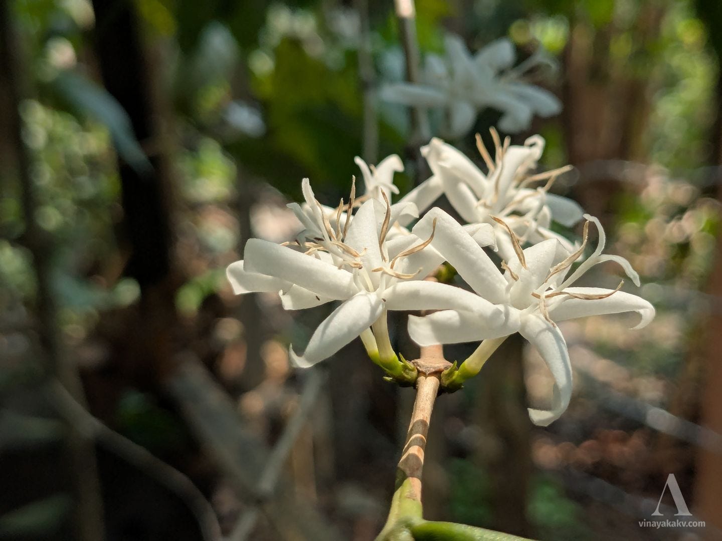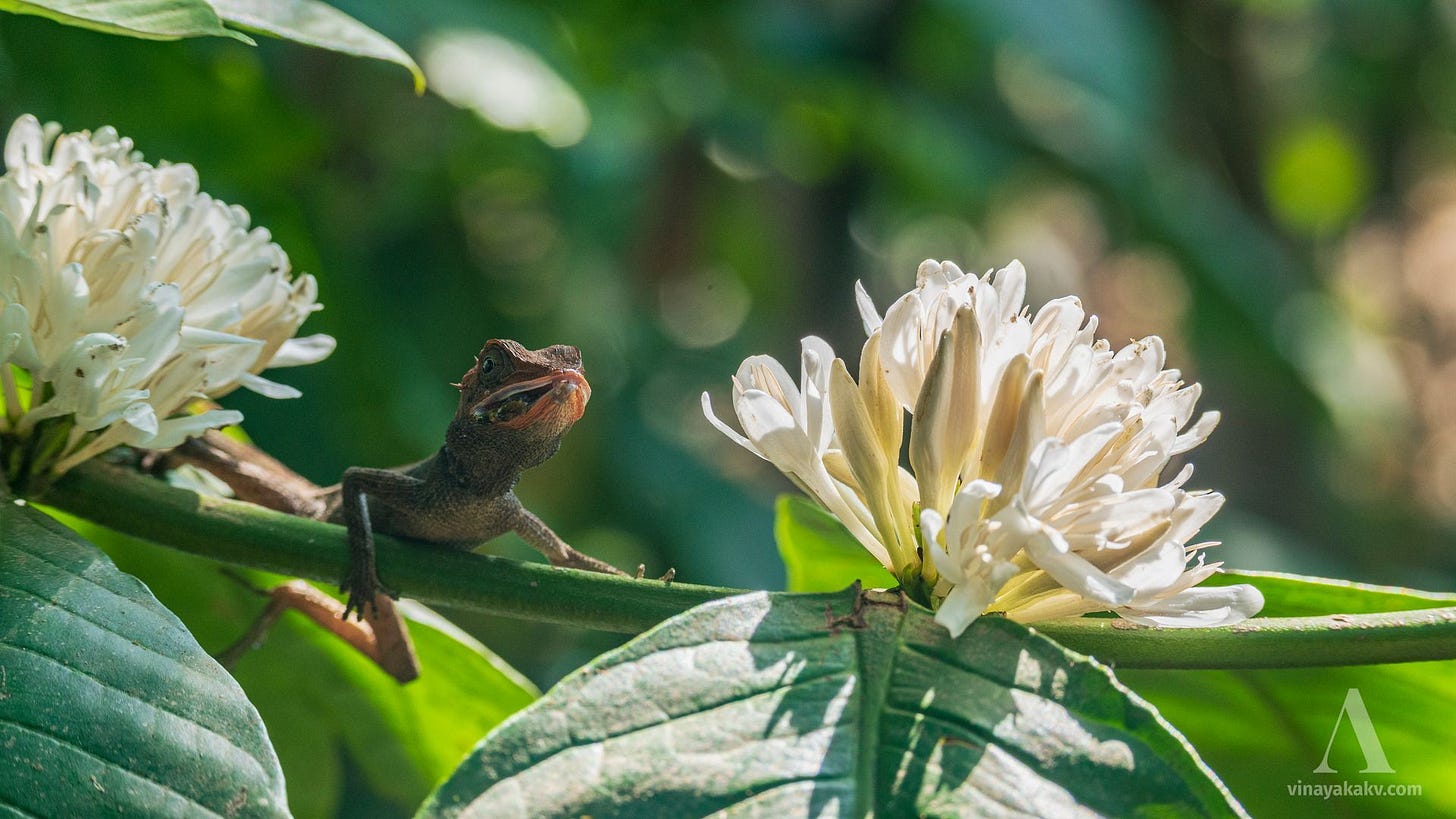 Although Coffee plants are not native to India, they are also critically dependent on the pre-monsoon rains to flower. If the rains arrive too early, they fruit during the monsoon, causing them to rot. If the rains arrive too late, they might not flower to their full extent. When they are in flower, they blanket the entire plantations with their jasmine-white color and an intoxicating aroma.