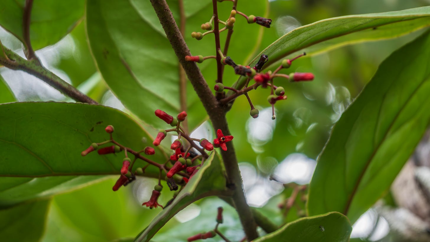 Once the trees reach a certain height, they become a habitat of their own — ranging from plants that use the tree as a support (epiphyte), such as orchids, to some who steal the nutrients from the tree for their survival. There are a few plants in the middle of the spectrum that steal water from the tree, but still photosynthesize themselves — semi-parasitic plants. The semi-parasitic plants of the family Loranthaceae put up showy flowers full of nectar to attract birds to aid their pollination. Their fruits are attractive as well, relying on the birds to help them spread to other tree tops.