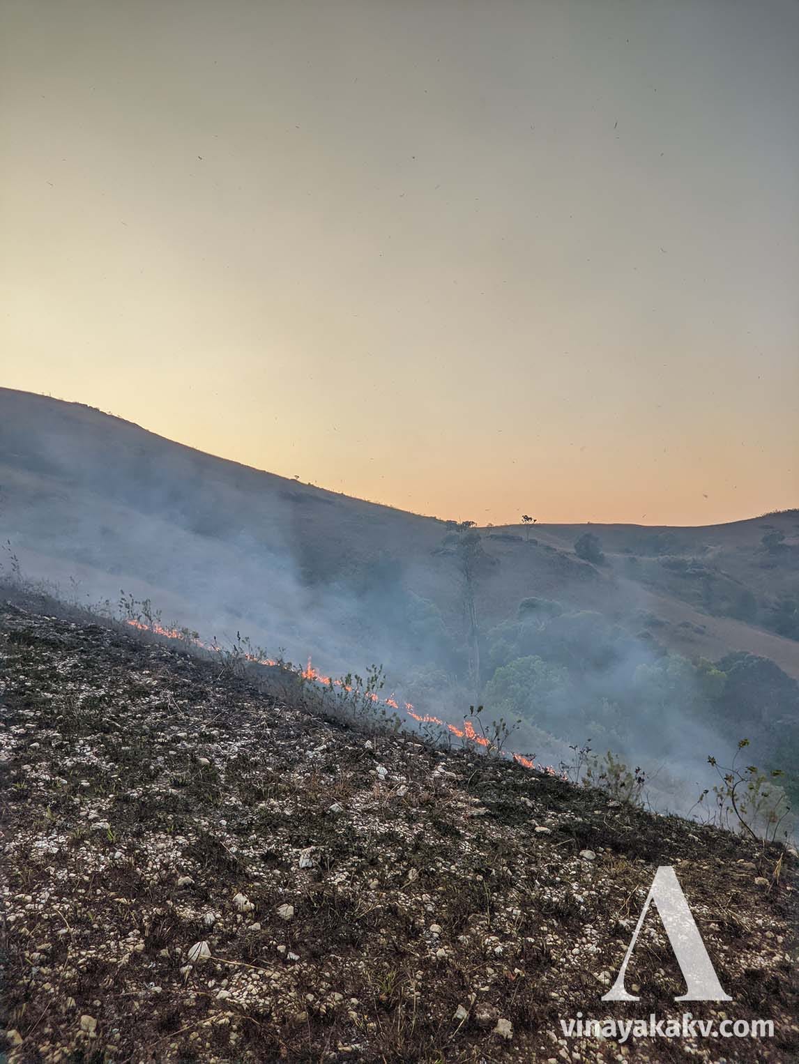 It is the tropical winter in the Western Ghats region of India. The winter here is not different from the summer, except the mountains experiencing cooler nights. As the water becomes scarce in the ground, many plants start to flower in the hopes of starting a new generation in the upcoming monsoon rains. The grasses set seeds and become dry. The Shola mountains, a mosaic of grassland intercepted by small forest patches, turn into an excellent fuel source, waiting for a spark of ignition.